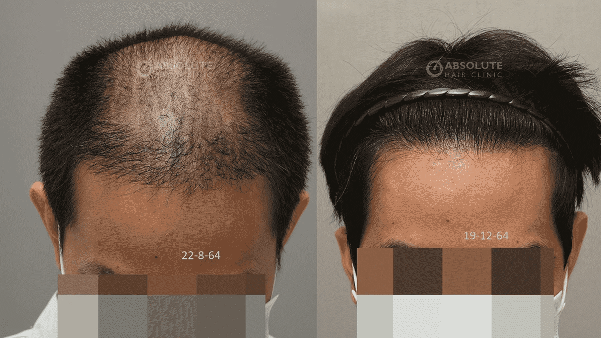 Before-and-after photos from a published randomized trial of apple extract showing visible improvement in hair density.